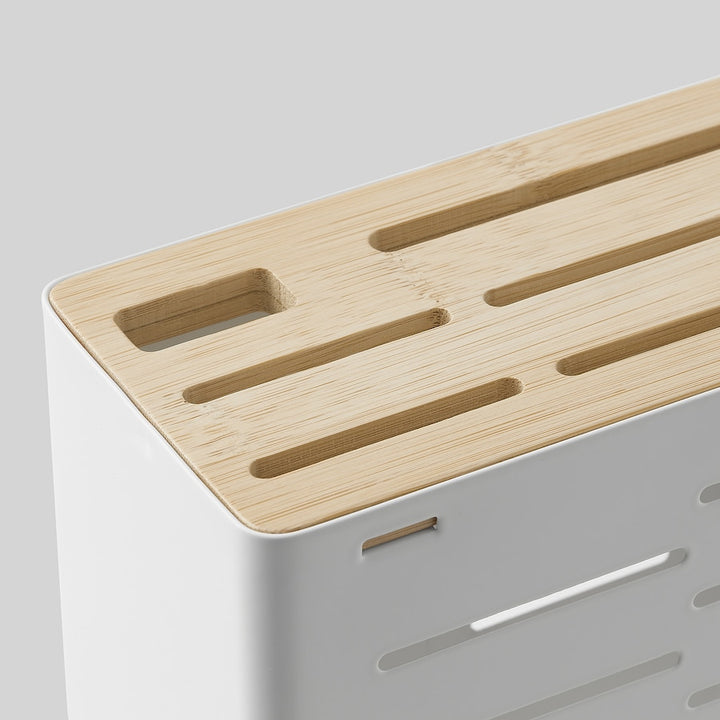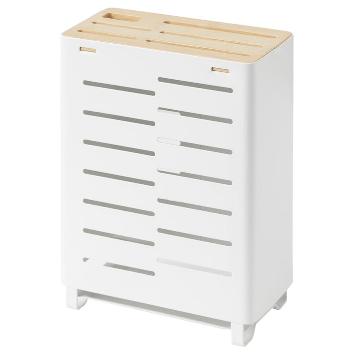 Protects your knives and saves space in your drawers. The holes in the front allow the knives to dry quickly since air can circulate. The knife holder has a simple expression in white and bamboo that fits nicely in all kitchens, regardless of style. To keep the inside dry and prevent mould from building up, there is a pull-out tray at the bottom that collects water from wet utensils.