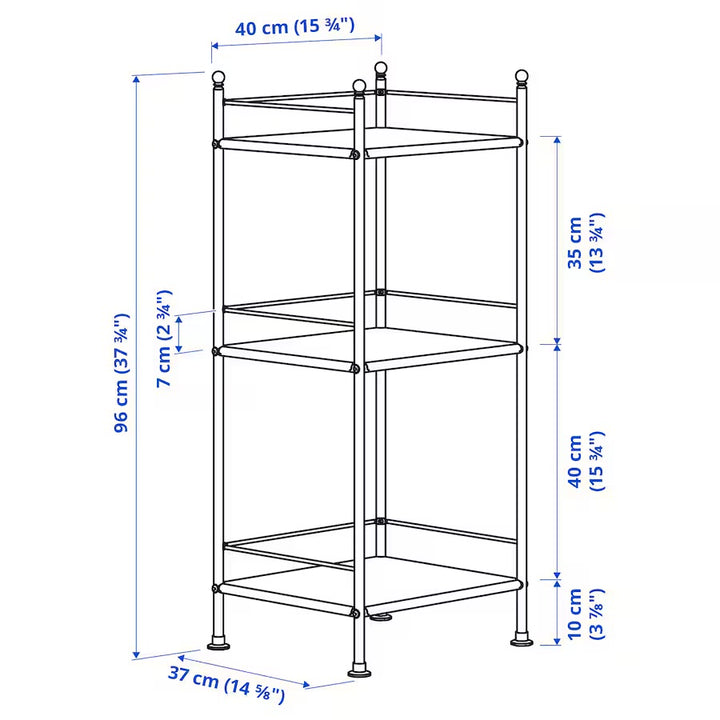 Removable shelves, easy to clean. The open shelves give an easy overview and easy reach. Adjustable feet make it possible to compensate any irregularities in the floor. The metal wires at the back and on the sides prevent things from falling off.